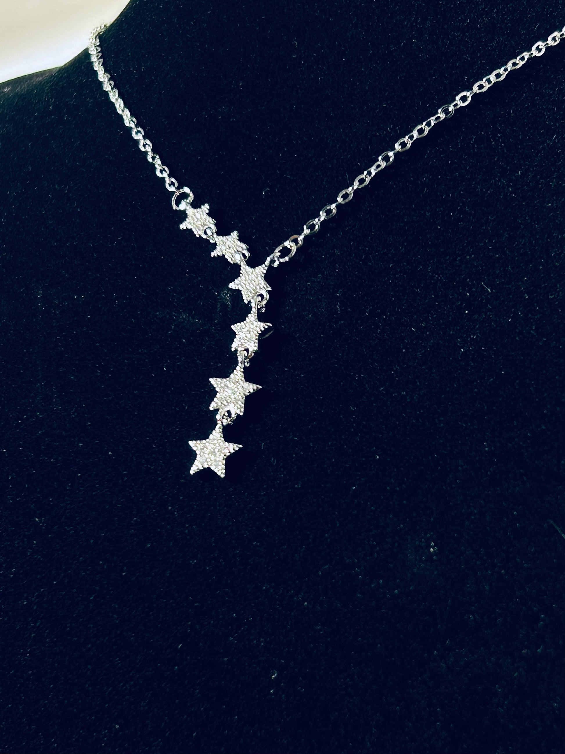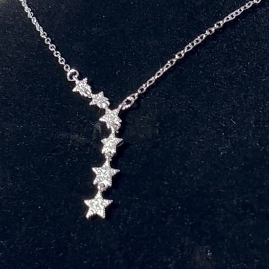 Named for Asteria, goddess of falling stars, night divination, and celestial mystery, this luminous necklace captures the magic of wishes whispered to the sky. A vertical cascade of sterling silver stars, each adorned with pavé zircon clusters, shimmers like a constellation caught mid-fall.