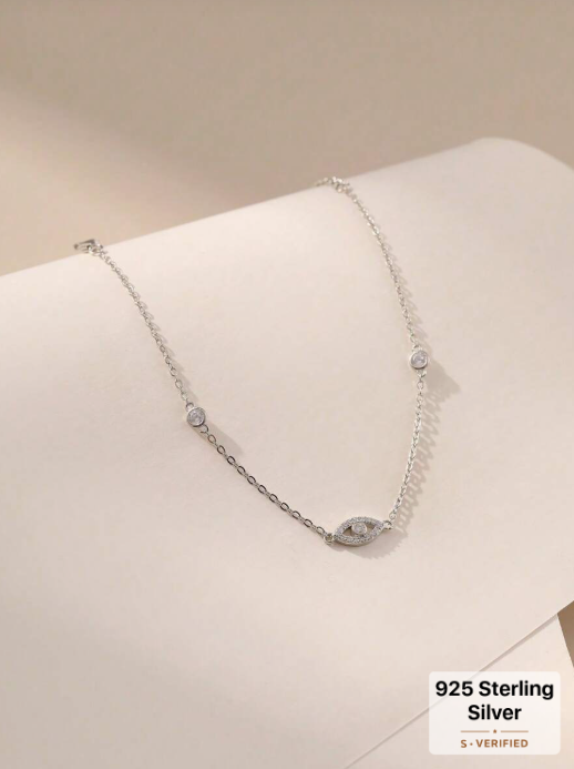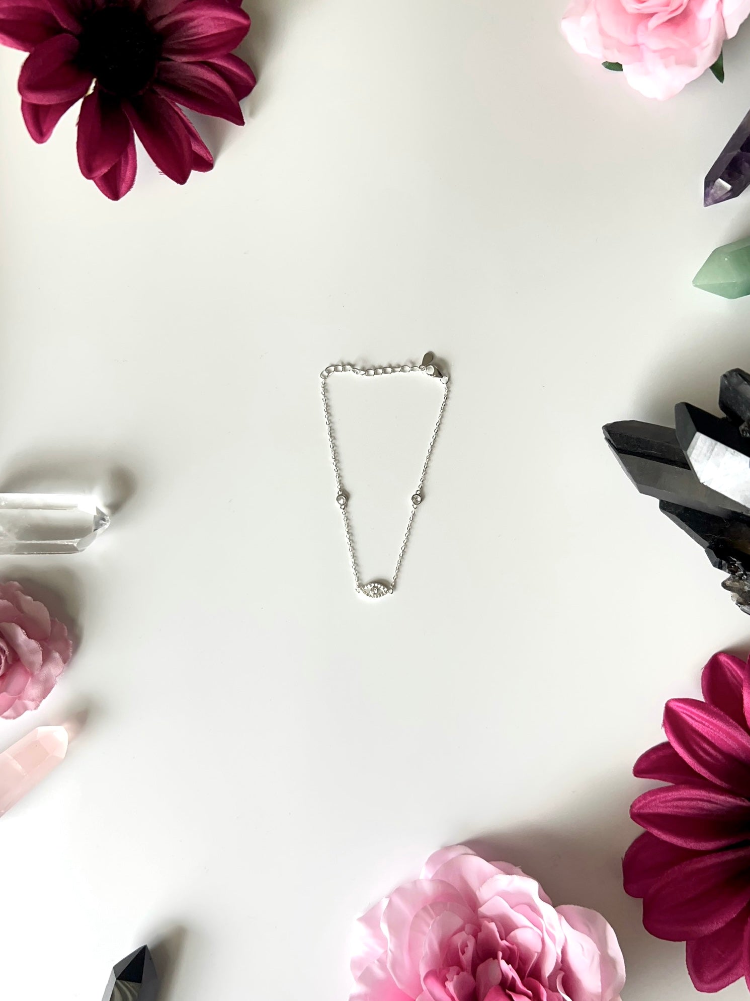 A dainty evil eye charm on a fine sterling silver chain. Made to protect your energy while complementing any stack, ritual, or mood.